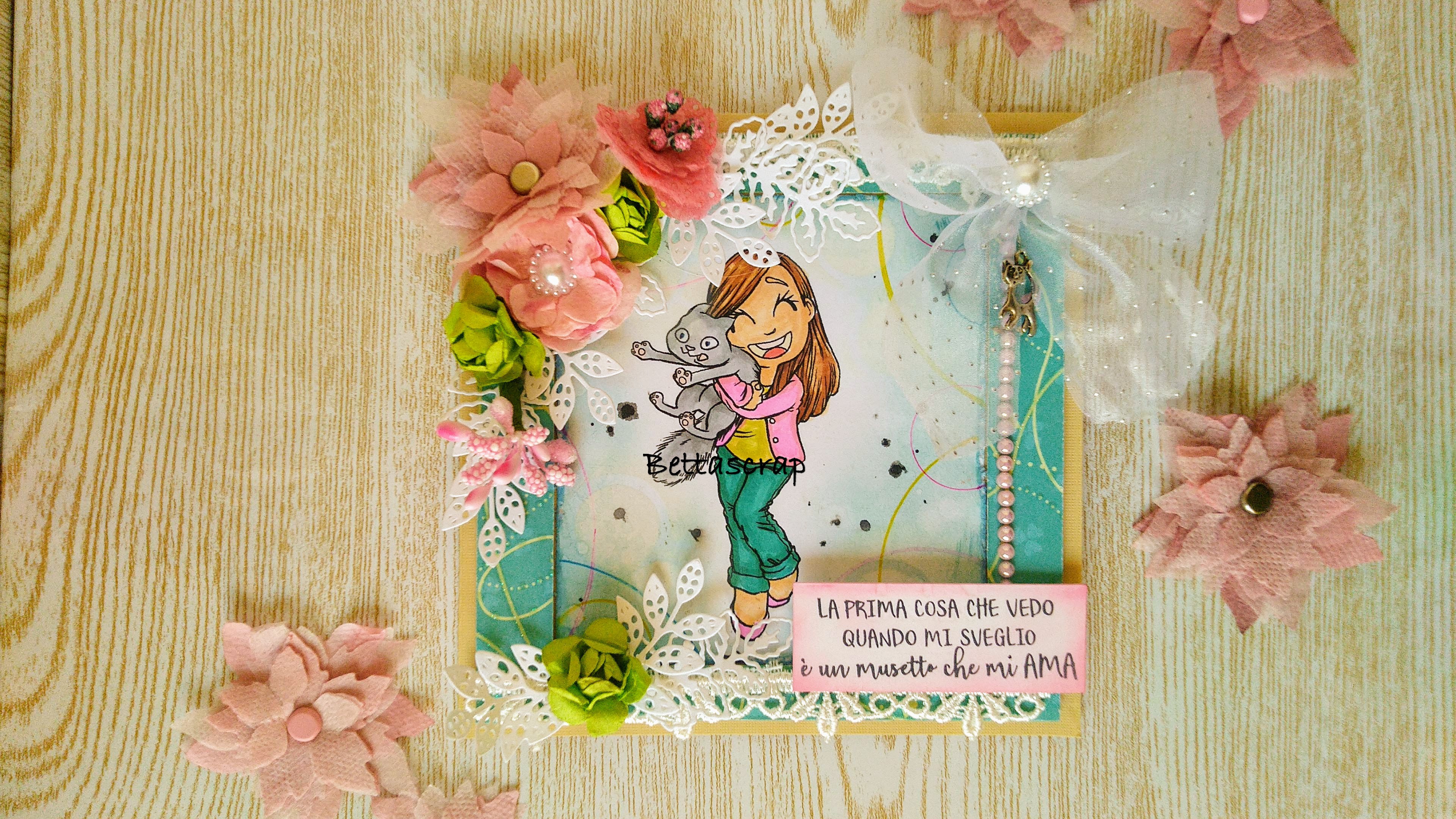 BELLA, bella, bella!!! La adoro e adoro anche i gatti, e sono sicura che farà sorridere moltissimo la fortunata destinataria!!! Il timbro è troppo carino, colorato benissimo e i sentiments sono speciali!!! E poi è un tripudio di stupendi dettagli!!!! Sei sempre più brava!!!!