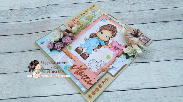 La base è un cartoncino mille righe di un verdino non ben definito 😅, sopra ho messo della carta scrap che ho mattato con del cartoncino di tre verdi differenti, ho messo un centrino bianco dietro l'immagine della Tilda che ho colorato coi pennarelli fustellata e mattata col cartoncino rosa timbrando in alcuni punti delle immagini di posta, ho messo un bellissimo pizzo avuto da Milly (GRAZIE!!!), ho messo dei fiori in due angoli opposti dell'immagine, ho scritto a mano la parola Merci e per dei tocchi di luce ho messo delle piccole file di strass e alcune paillettes.